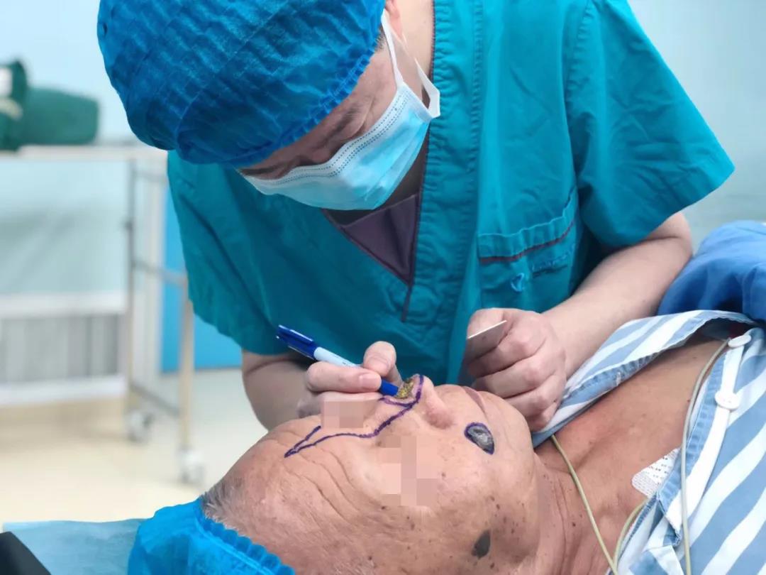 术前,李红根据患者鼻缺损区域,标记出手术切缘边界,同时勾画出游离皮瓣制定修复方案。